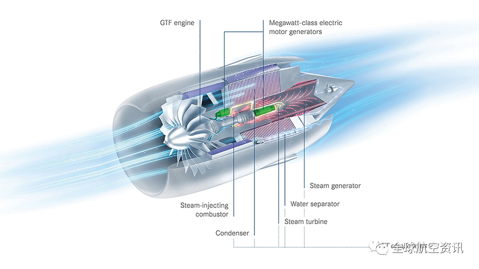 在亞音速領(lǐng)域,空客公司還與普惠公司和MTU航空發(fā)動機公司合作,參與歐洲“清潔航空”研究計劃下的另一個先進推進項目Switch。Switch的目標(biāo)是在21世紀30年代中期投入使用,目標(biāo)是減少25%的二氧化碳排放,減少80%的氮氧化物排放,并減少不明原因的尾跡排放。在WET概念下,從廢氣中收集水,并使用熱交換器將水蒸發(fā)成蒸汽。蒸汽被注入燃燒室,從而提高了燃料效率。